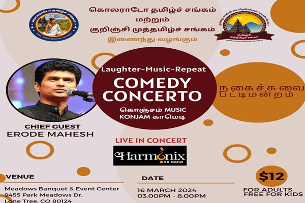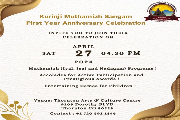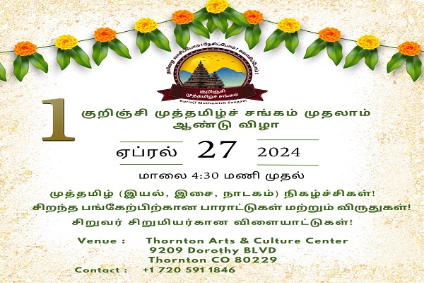 Kurinji Vidumurai Kontattam held on Dec 6th 2025 is a cultural celebration showcasing Tamil language, music, dance, and outstanding drama presentation by kids and community adult members. The event is graced by our Chief Guests, Mrs. Lori Goldstein, President, Board of Education, Adams12 Five Star Schools, and Mr. Janak Joshi, Former Colorado State Representative.