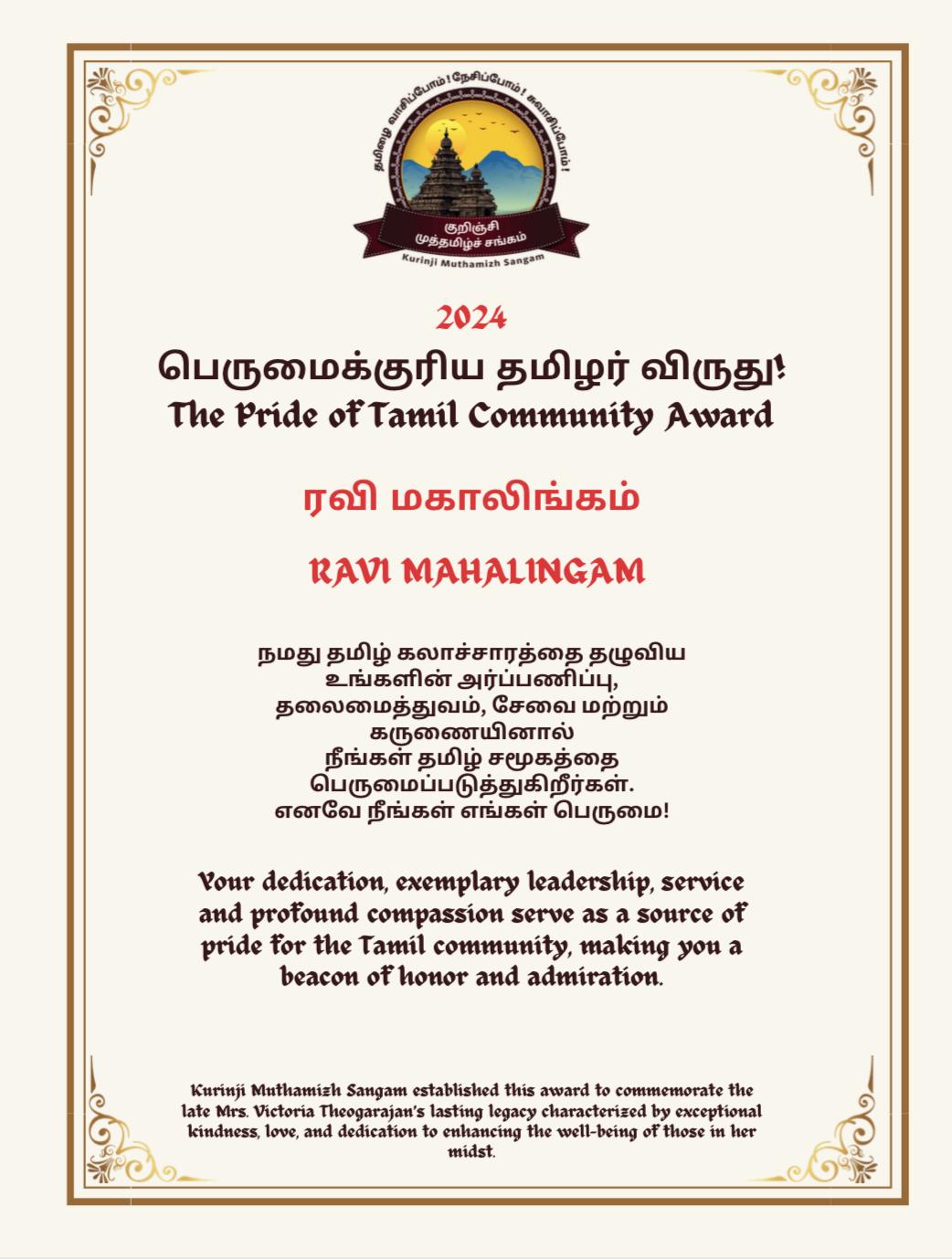 திரு ரவி மகாலிங்கம் அவர்கள் கொலராடோ, அரோரா, அன்சுட்ஸ் மருத்துவ வளாகத்தில் நரம்பியல் துறையில் ஆராய்ச்சி பேராசிரியராக உள்ளார். அவர் ஆசிரியர் குழுவில் பணியாற்றினார் மற்றும் பல்வேறு பத்திரிகைகளை மதிப்பாய்வு செய்தார். அவரது பெயரில் #138 வெளியீடுகள் உள்ளன. அவர் பல மாணவர்கள் மற்றும் முதுகலை பட்டதாரிகளுக்கு வழிகாட்டியாக உள்ளார் மேலும் இந்த சமுதாயத்திற்கு சேவை செய்து வரும் பல இளம் தொழில் வல்லுநர்களின் வாழ்க்கையில் ஒரு மாற்றத்தை ஏற்படுத்தியுள்ளார். மனித உடல்நலம் தொடர்பான பல காப்புரிமைகளை அவர் பெற்றுள்ளார். கொலராடோ தமிழ் சங்கத்தின் முதல் தலைவராக இருந்தார். அவர் சங்கத்தின் ஆரம்ப கட்டத்தில் சவால்களை கடந்து, அன்பான உறுப்பினர்களின் உதவியுடன் இன்றுவரை அதை வெற்றிகரமாக செய்தார். குறிஞ்சி முத்தமிழ்ச் சங்கம் திரு.ரவி மகாலிங்கம் அவர்களுக்கு “2024ஆம் ஆண்டுக்கான தமிழ்ச் சமூகத்தின் பெருமைக்குரிய தமிழர் விருது " வழங்கி கௌ 4ஆரவித்ததில் பெருமை கொள்கிறது.
