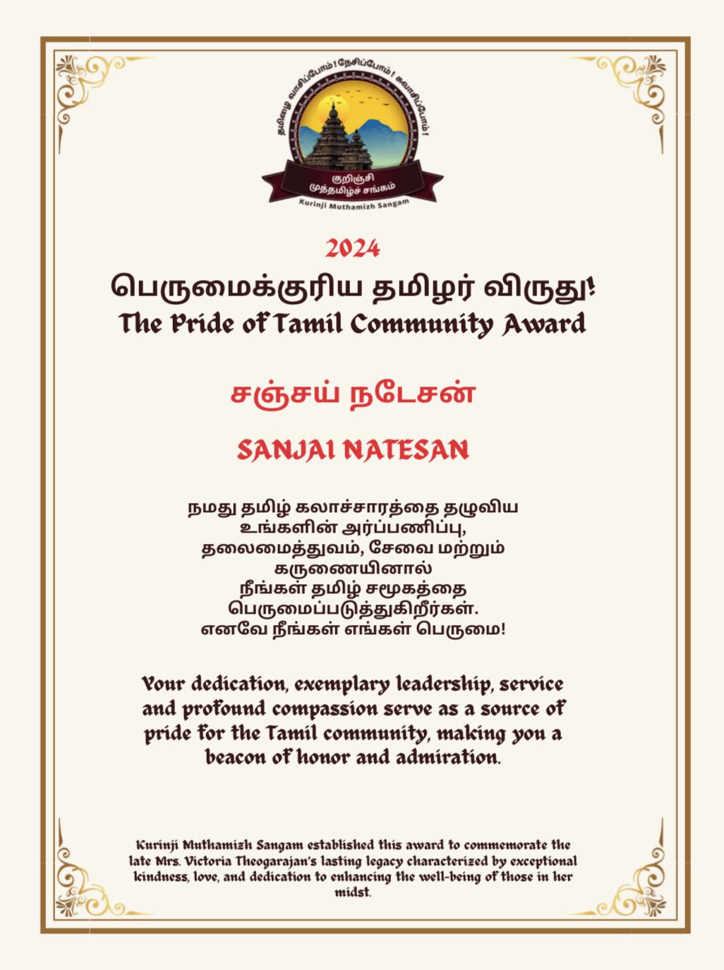 திரு. சஞ்சய் நடேசன் மிகவும் நேர்மறை மற்றும் மகிழ்ச்சியான அணுகுமுறை கொண்ட அற்புதமான மனிதர். கொலராடோவில் உள்ள தமிழ் சங்கத்தின் ஒரு அங்கமான அவர், இந்திய சமூகத்திற்கு ஏராளமான சேவைகளை செய்துள்ளார், தனிப்பட்ட திறனிலும், இந்து கோவிலான ராக்கீஸ் குழுவின் உறுப்பினராகவும் உள்ளார். அவர் இரத்த தான பிரச்சாரங்கள், உணவு நன்கொடை இயக்கங்களை ஏற்பாடு செய்துள்ளார் மற்றும் கொலராடோ சமூகத்திற்கு பயனளிக்கும் பல சமூக காரணங்களுக்கு ஆதரவாக இருந்து வருகிறார். இந்திய சமூகத்தின் இளைஞர்கள் தங்கள் திறமைகளை வெளிப்படுத்தவும், அடுத்த தலைமுறையினரிடையே மொழி மற்றும் கலாச்சாரத்தின் ஆர்வத்தை வளர்க்கவும் பல போட்டிகள் மற்றும் நிகழ்வுகளை அவர் ஏற்பாடு செய்துள்ளார். தம்மை அணுகும் எவருக்கும் அவர் உதவிக்கரம் நீட்டுகிறார். திருமதி விக்கி சிசில் விட்டுச் சென்ற நேர்மறை ஆற்றலும் உற்சாகமும் திரு. சஞ்சயின் நமது சமுதாயத்திற்கான பணியின் மூலம் அதிகம் காணப்படுகின்றன. குறிஞ்சி முத்தமிழ்ச் சங்கம் திரு. சஞ்சய் நடேசனுக்கு “2024 ஆம் ஆண்டிற்கான தமிழ்ச் சமூகத்தின் பெருமை விருது" வழங்கி கௌரவித்ததில் பெருமை கொள்கிறது.